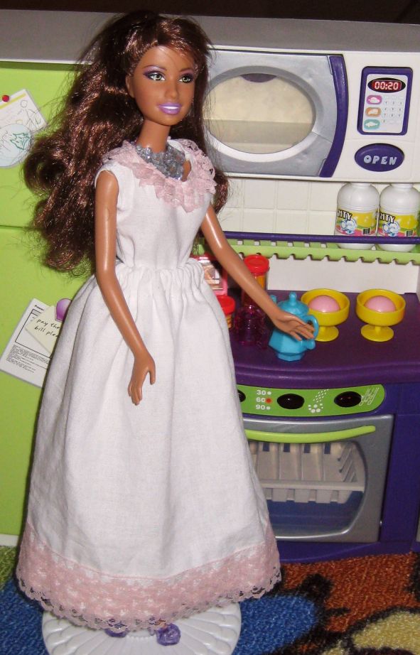 Minulla Anneliesella on päällä eilen valmistunut puku. Se on tehty Varsan vanhasta kukallisesta paidasta. Helmassa on vähän pitsiäkin. Seison kuvassa kruunukoristeisen korokkeen päällä.
